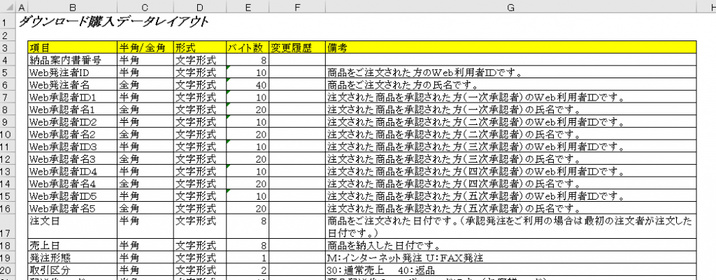 ▼ダウンロードデータ項目説明書例