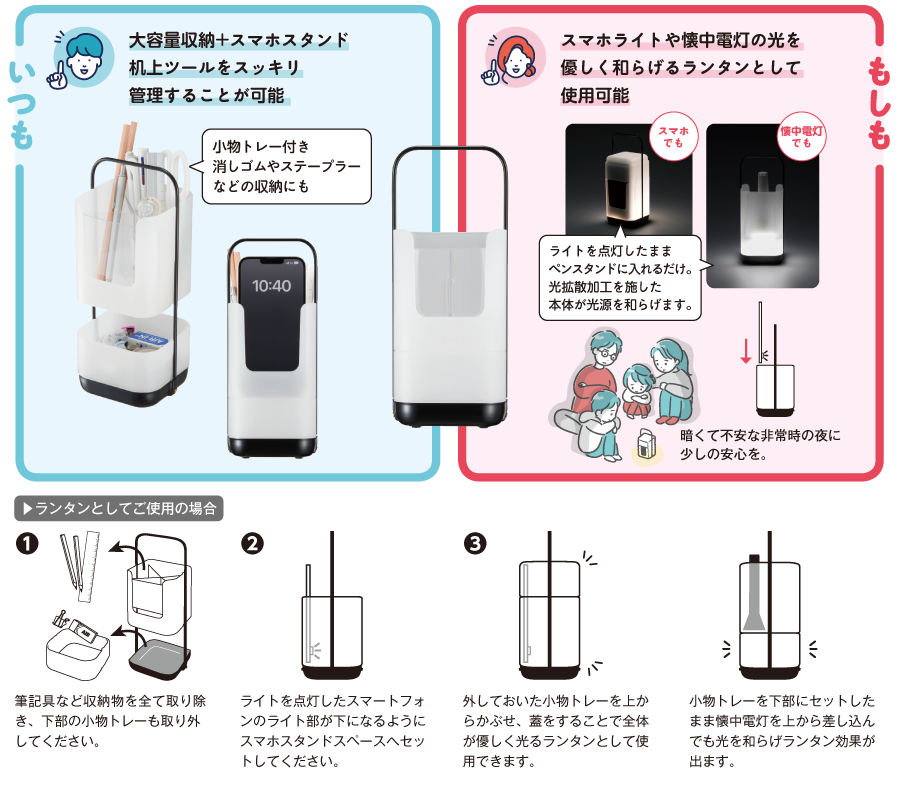 一般的に防災用品のほとんどは、普段はしまっていて、非常時の際に取り出して使うものです。一方、いつもの生活で便利に使えるのはもちろん、もしもの時にも役立つ、「いつものときも、もしものときも」常に私たちが快適に心地よく活用できる商品・サービス・アイデアが「フェーズフリー」です。