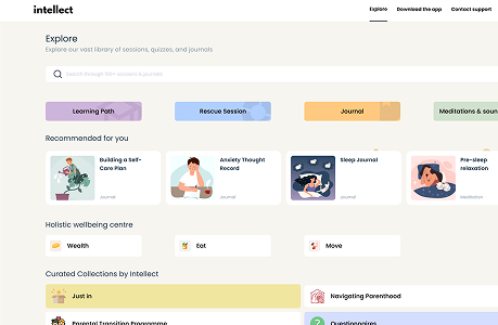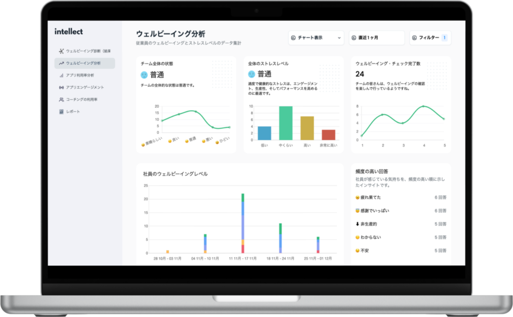Intellectは、全方位型のプラットフォームです。従業員はそれぞれにとって最適な時間や場所からサービスを利用できるため、高い利用率を実現。対話を通じた人材の育成支援から個別特化したケアなど、組織ごとの課題に応じた支援を提供しています。