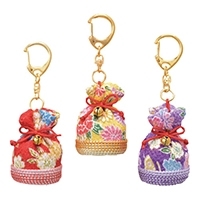 ペットボトルのふたを使用して作る簡単エコ手芸。●セット内容:ちりめん生地、メタリックヤーン、赤紐、鈴、キーホルダー金具、綿●完成寸法:約縦45×横35mm●完成個数:3個●用意するもの:はさみ、木工用接着剤、ものさし、両面テープ、縫い針、縫い糸、ペットボトルのキャップ(直径約30mmのもの)●材質:ちりめん生地=レーヨン100%、メタリックヤーン=レーヨン・ポリエステル、赤紐=レーヨン、鈴=真鍮、キーホルダー金具=鉄●入数:3個●製造国:日本