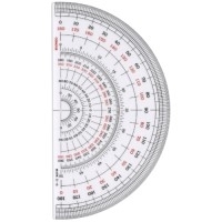 表面のマット加工が反射を防ぎ読み取りが容易です。マット調なので分度器本体に鉛筆等で印が書き込めます。目盛は線や文字が薄くなりにくい箔押し仕様。中心に位置決めしやすいガイド入りです。●規格:半円18cm●仕様:0.5度の目盛付●材質:硬質PVC●製造国:日本