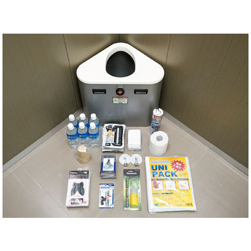 スツール内部に非常用品を収納。地震・停電・故障の時に。普段はエレベーター内の優先席として、また災害や停電、故障によってエレベーター内に閉じ込められてしまった場合には、中に収納されている非常用品を利用して待機することができます。さらに本体は非常用トイレとしても使用できます。