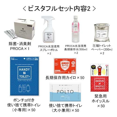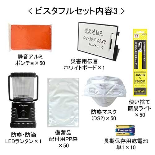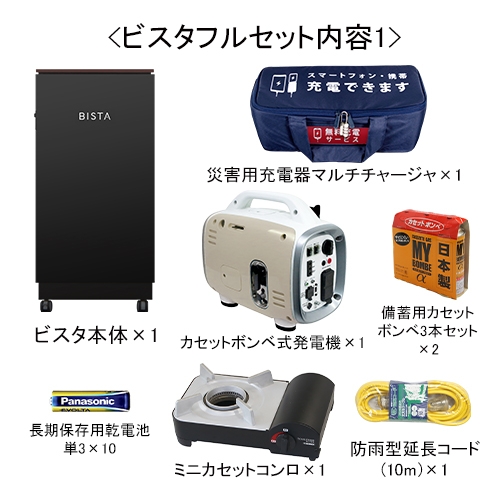 ●セット内容:カセットボンベ式発電機(G-cubic crema smart+)×1機/ヒーター用乾電池(エボルタ単3)×10本/高速充電器マルチチャージャ×1機/防雨型延長コード(10m)×1本/備蓄用カセットボンベ×6本/ミニカセットコンロ×1個/大小便兼用使い捨て携帯トイレ×50個/小便専用使い捨て携帯トイレ×50個/長期保存カイロ×50個/緊急用ホイッスル×50個/使い捨て簡易ライト×50個/静音アルミポンチョ×50個/3M防塵マスク×50枚/感染症対策品(除菌・消臭剤PROCA×48包、スプレーボトル×2本、水500ml×2本)/200m圧縮トイレットペーパー×2個/災害用伝言ホワイトボード×1枚/防塵・防滴LEDランタン×1個/ランタン用乾電池(エボルタ単1)×10本/備蓄用品配布用PP袋×50枚