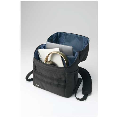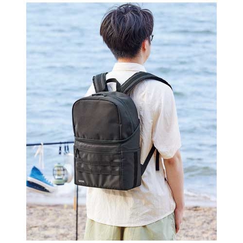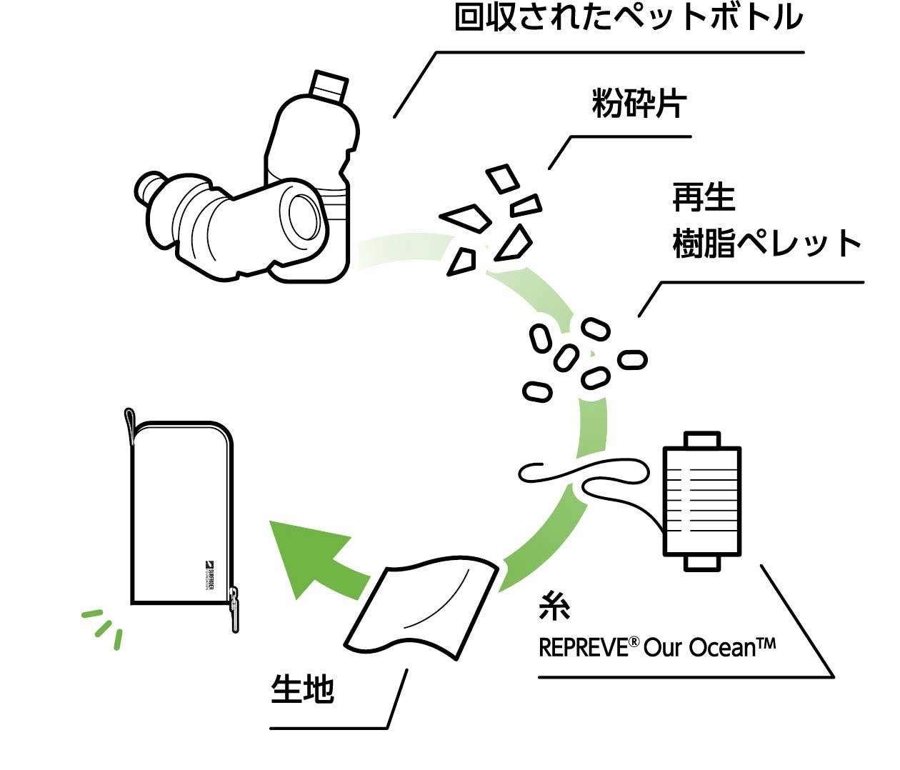 オーシャンバウンドプラスチック※を採用したバックパック。側面のファスナーが大きく開き、自立します。(※海岸から50km以内の内陸部に廃棄され、雨水・川の流れや潮流によって最終的に海に流出する可能性の高いプラスチックごみ。)