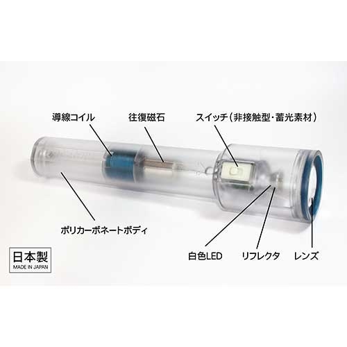 30秒振るだけで20分間点灯、長期保管に適した災害時特化型LEDライト。半永久寿命の蓄電装置搭載で災害用備蓄としても適しています。完全防水(水深100m)設計で豪雨や水害時にも使用できます。暗闇で発光する蓄光スイッチ採用で突然の停電にも対応。