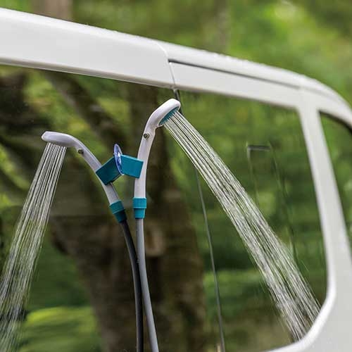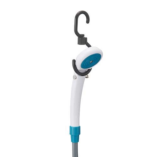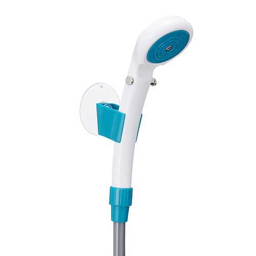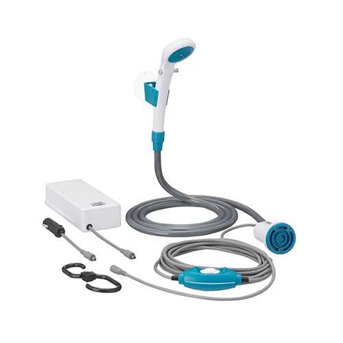 DC12Vで車から電源が取れるだけでなく、電池でも使える2WAYタイプの簡易シャワー。水と容器さえあればどこでも使えるので、野外でのちょっとした洗浄や、アウトドア、有事の際にも活躍します。付属のS字フックや吸盤式ホルダーを使用し、お好みの場所に取り付けることができ、両手が使えるハンズフリースタイルに。