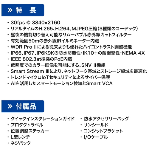 ●付属品: クイックインスタレーションガイド、プロダクトラベル、位置調整ステッカー、L型レンチ、ネジパック、防水アクセサリーバッグ、サンシールド、コンジットブラケット、I/Oケーブル