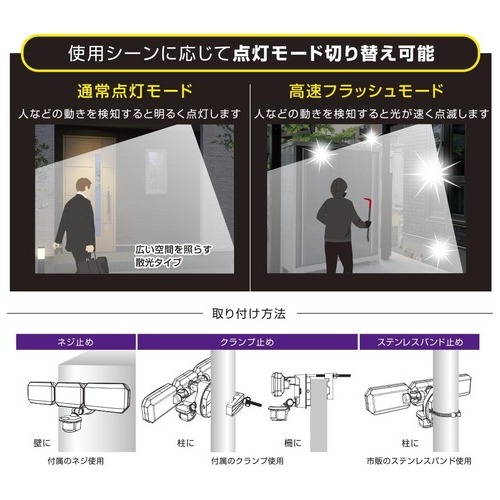 ●センサー:検知方式…焦電型赤外線センサー、検知範囲…最大約180° 最長約15m(取り付け高さ約2mの場合)、向き調節可能左右各150°