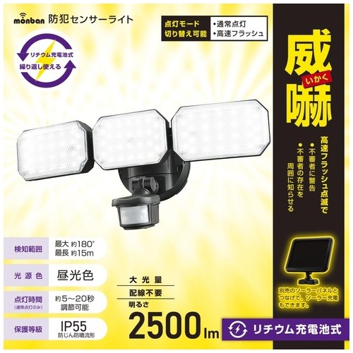 リチウム充電池式の防犯センサーライト。専用のソーラーパネル(別売)と併用することで充電の交換回数が少なくなります。