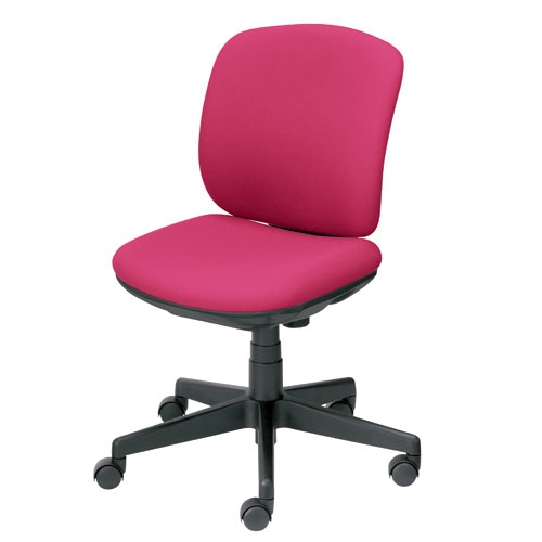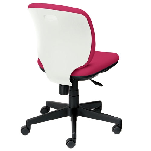 背のホワイトシェルと豊富なカラーバリエーションが特徴の事務イス「プリセア」/肘なしピンク。やさしい曲線が体にフィットするコンパクトサイズのチェアです。背の背面には手掛けが付いていて、チェアの移動や出し入れがしやすくなっています。