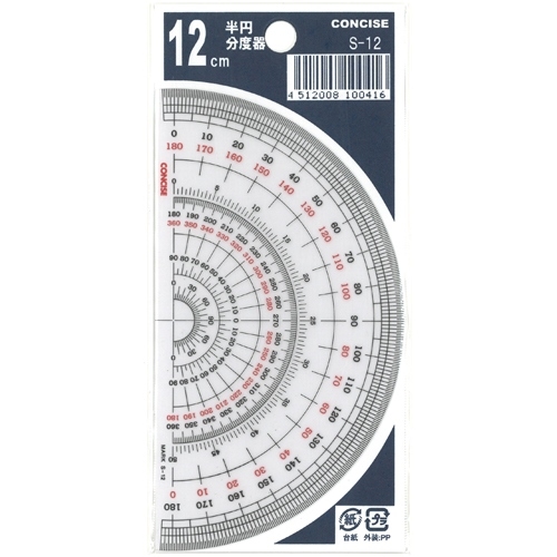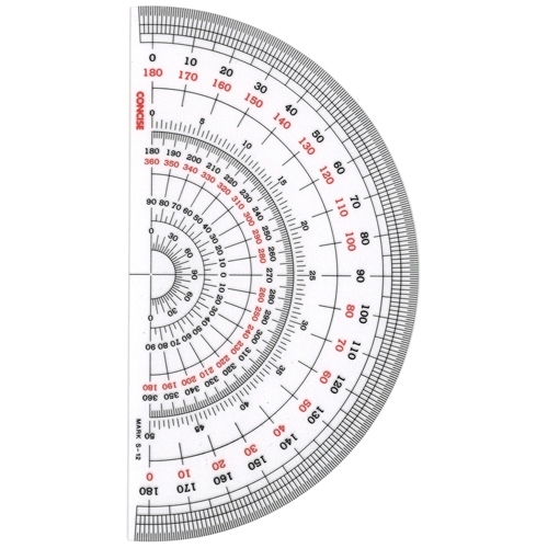 表面のマット加工が反射を防ぎ読み取りが容易です。マット調なので分度器本体に鉛筆等で印が書き込めます。目盛は線や文字が薄くなりにくい箔押し仕様。中心に位置決めしやすいガイド入りです。