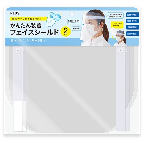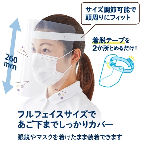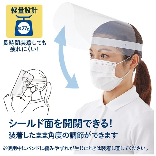 着脱テープを2か所とめるだけ!かんたん装着フェイスシールドです。シールド面を開閉できる!装着したまま角度の調整ができます。